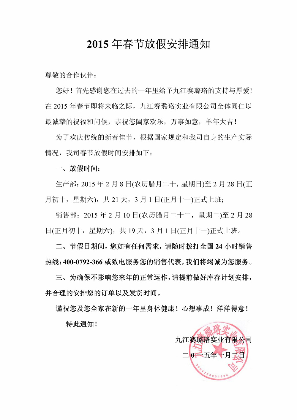 您好!首先感謝您在過去的一年里給予九江賽璐珞的支持與厚愛! 在2015年春節即將來臨之際,九江賽璐珞實業有限公司全體同仁以最誠摯的祝福和問候,恭祝您闔家歡樂,萬事如意,羊年大吉!