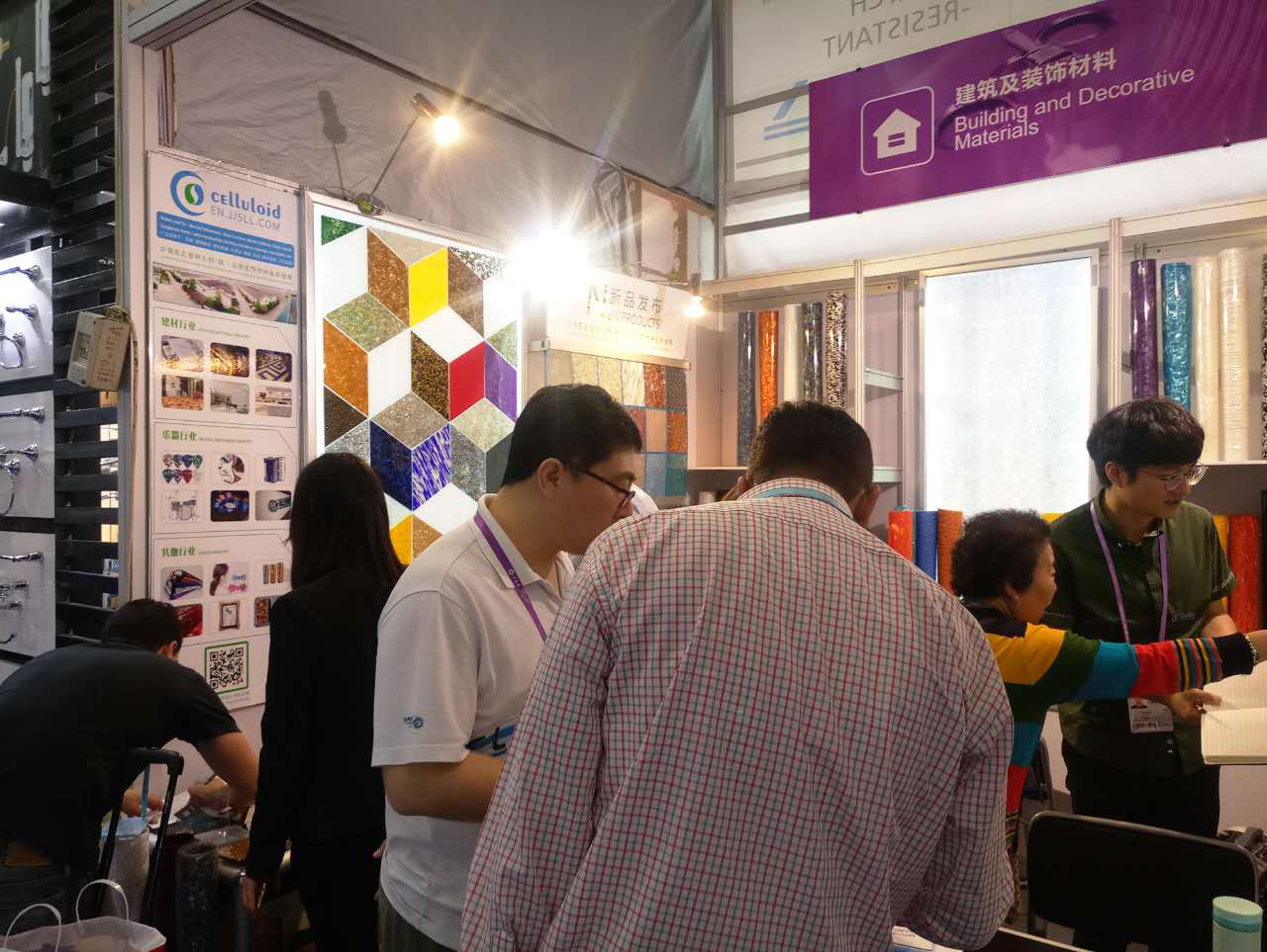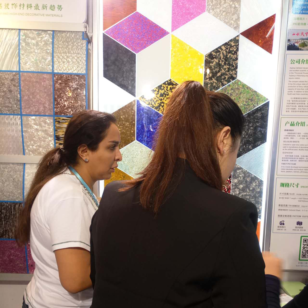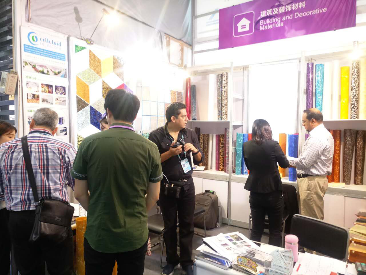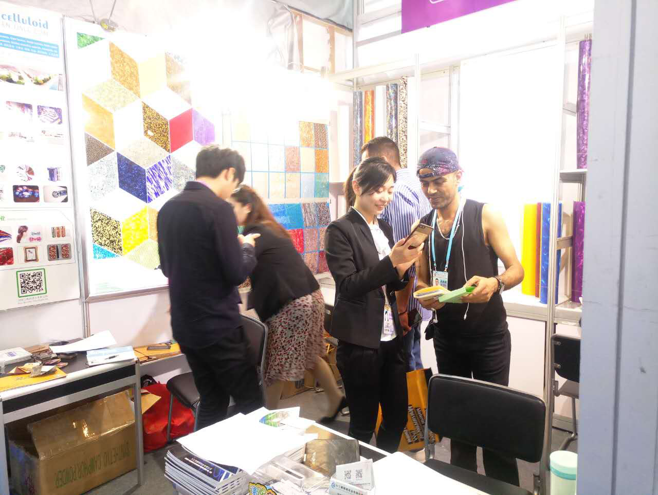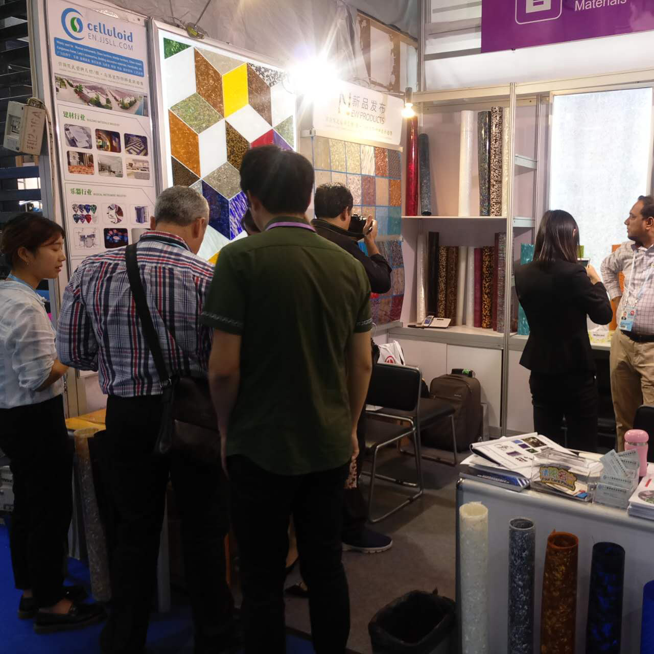 我司本屆主要展出:賽璐珞片,PVC裝飾膜及PC幻彩膜三大系列產品,繼上屆推出PC幻彩膜后,本屆又推出彩云、幻彩、貝殼、花式等多款系列新品,獲得了大量的國外客戶的關注和青睞。