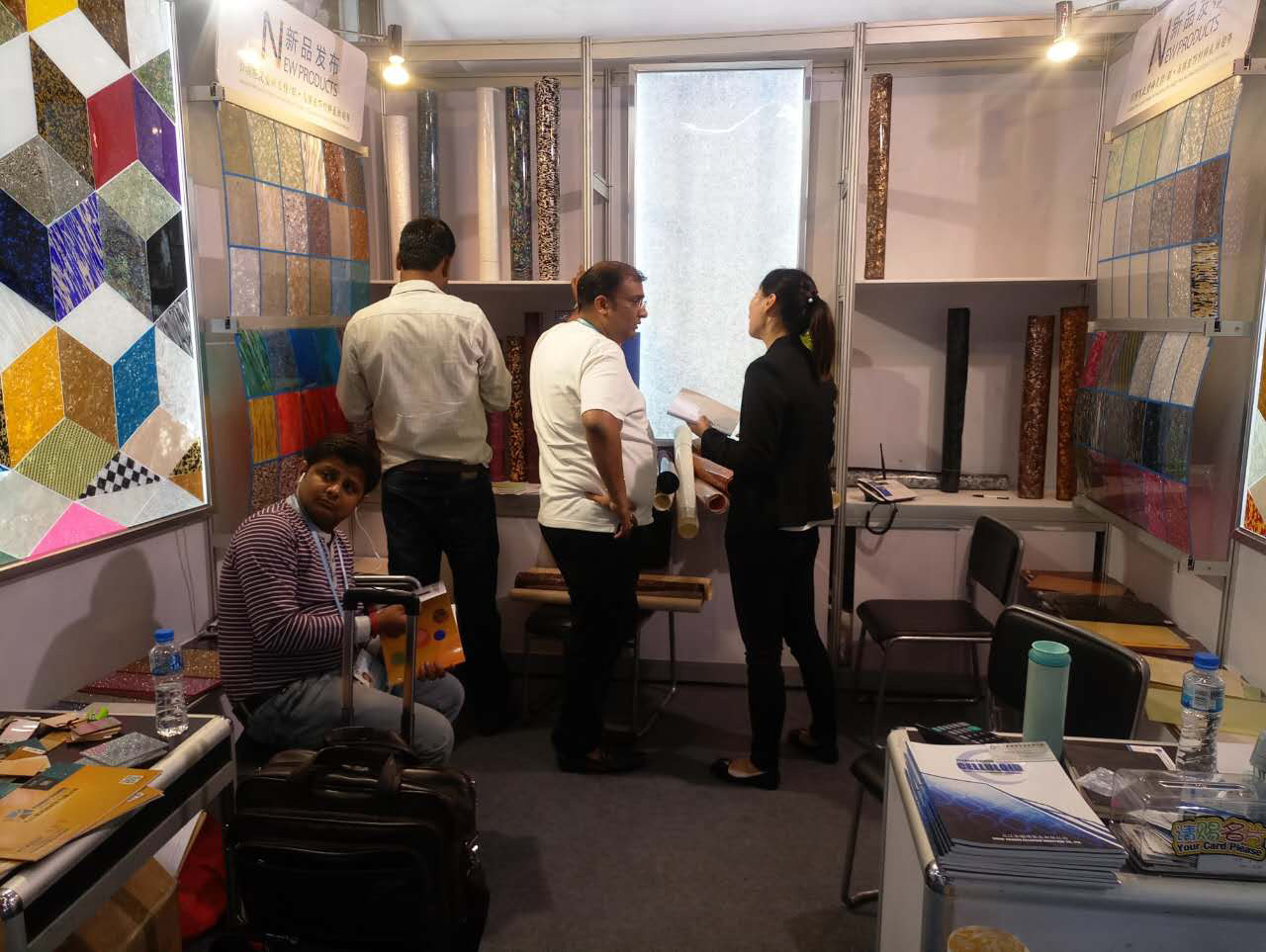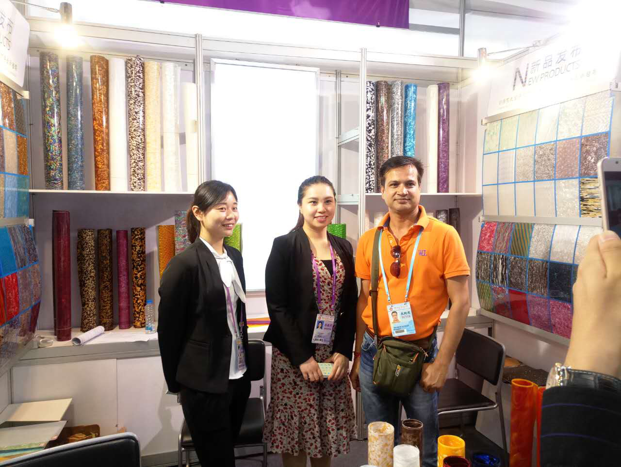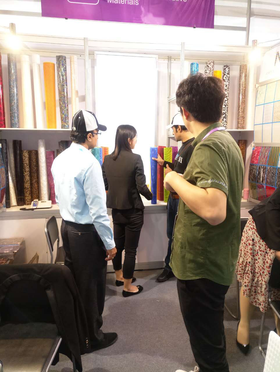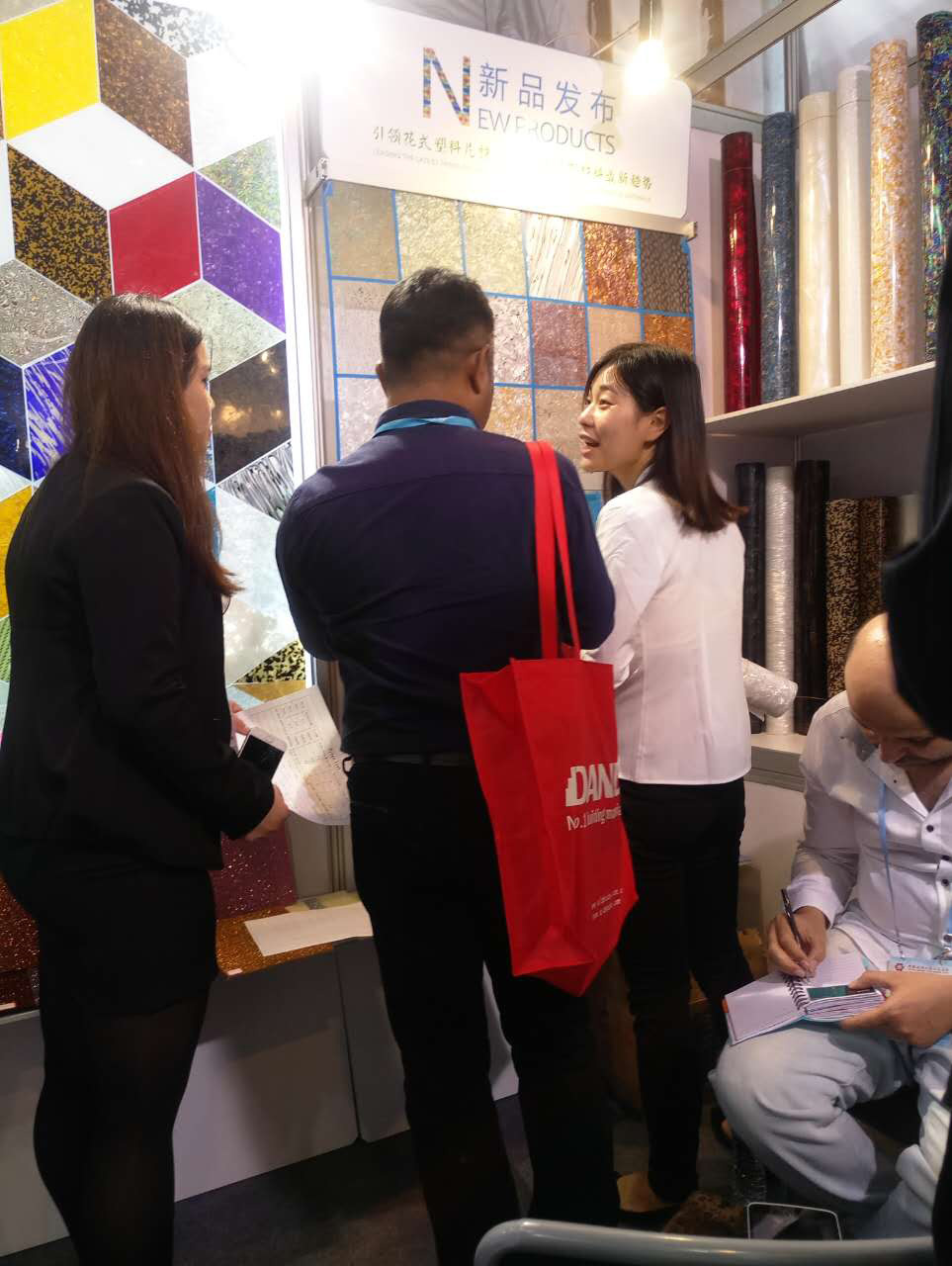 我司本屆主要展出:賽璐珞片,PVC裝飾膜及PC幻彩膜三大系列產品,繼上屆推出PC幻彩膜后,本屆又推出彩云、幻彩、貝殼、花式等多款系列新品,獲得了大量的國外客戶的關注和青睞。
