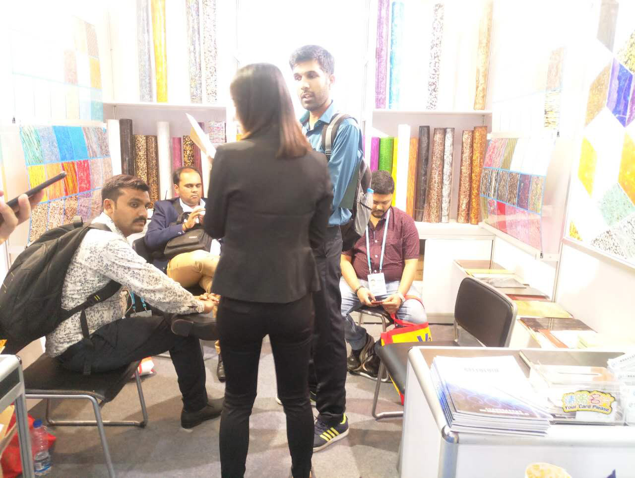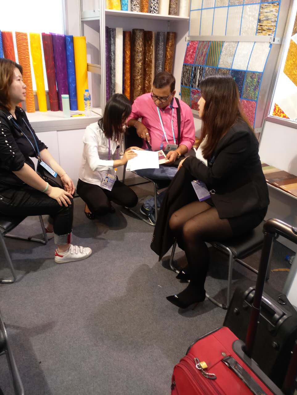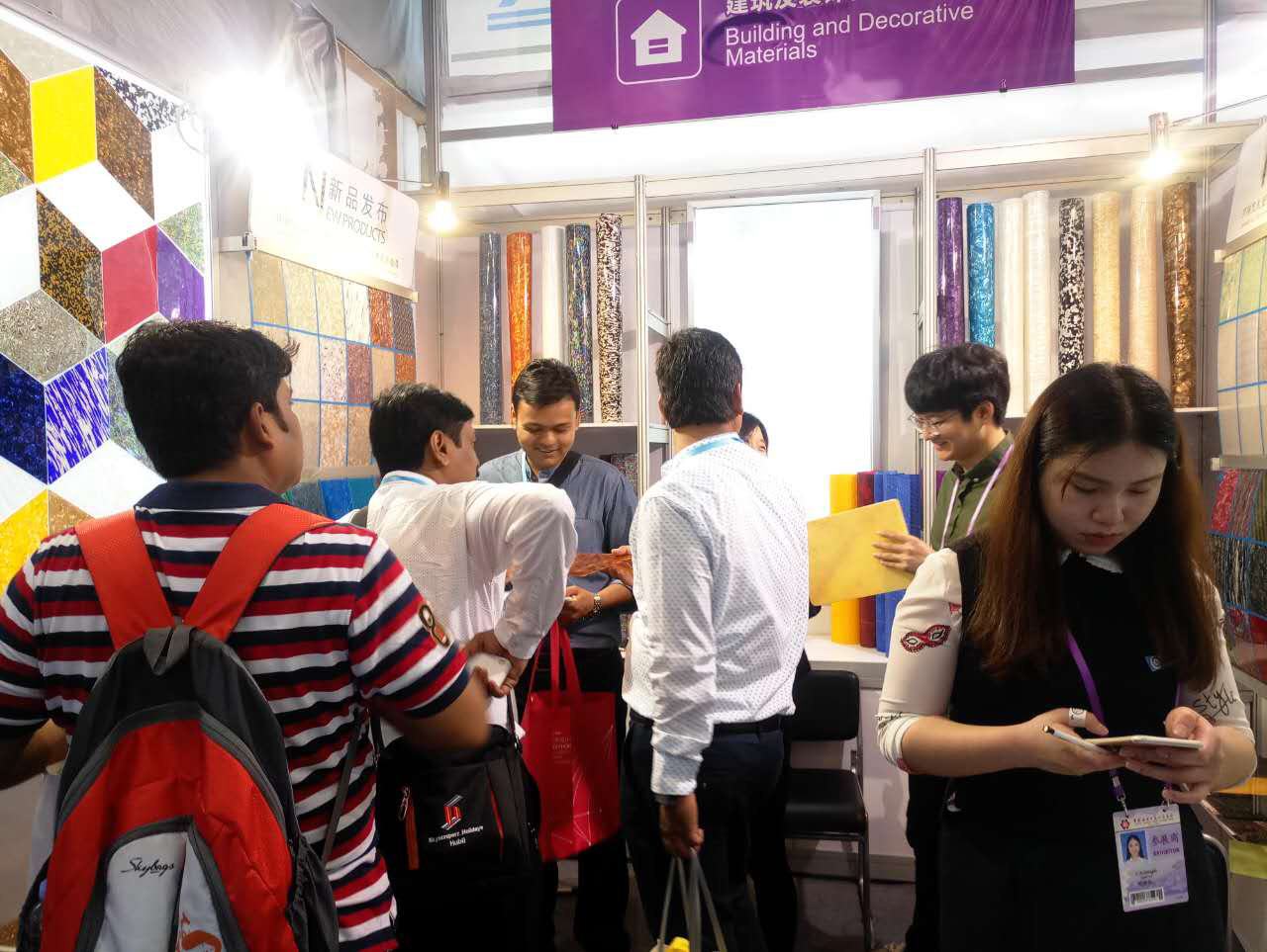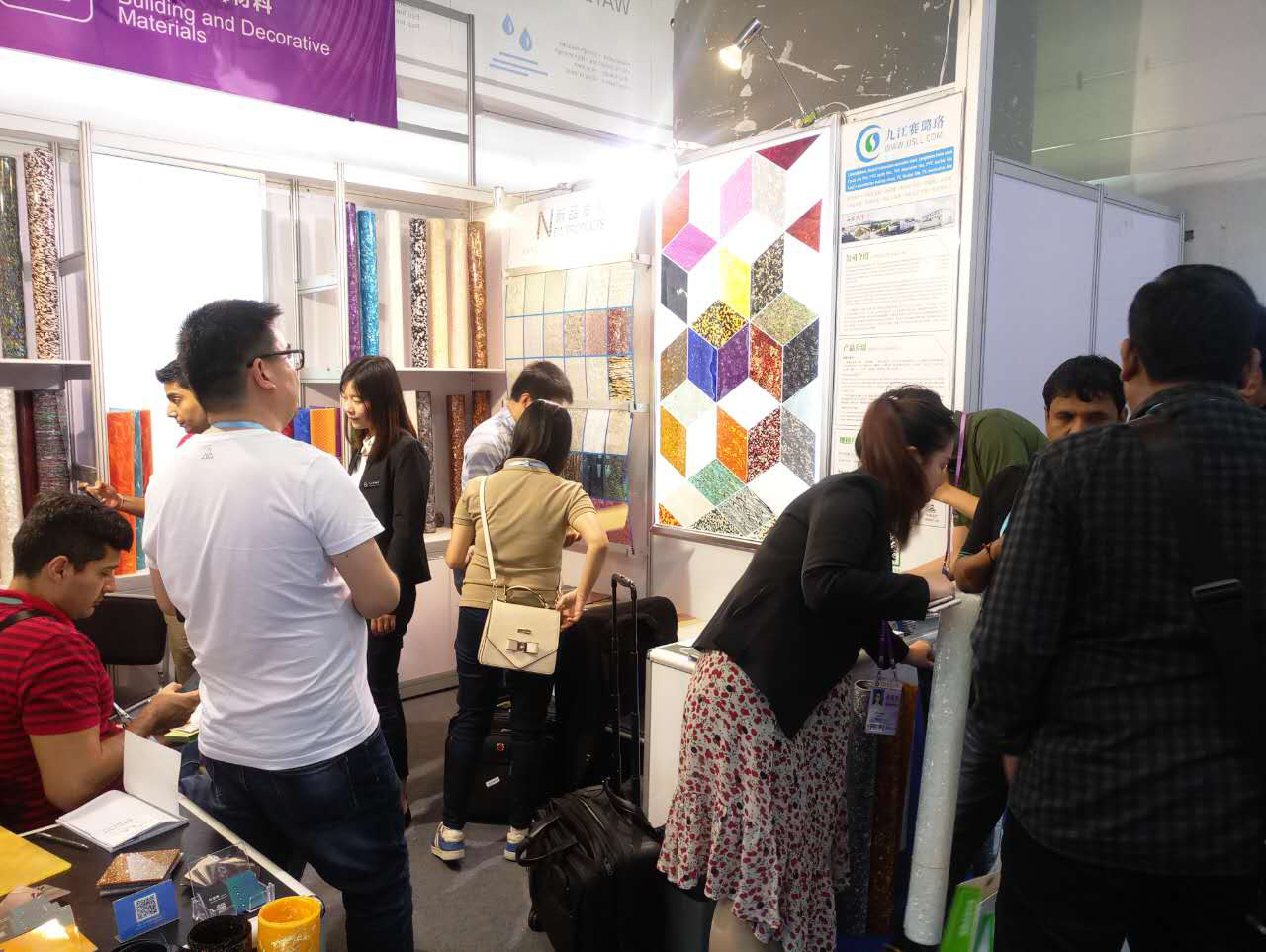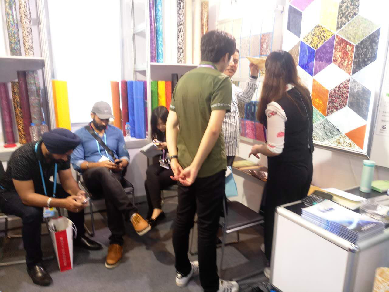我司本屆主要展出:賽璐珞片,PVC裝飾膜及PC幻彩膜三大系列產品,繼上屆推出PC幻彩膜后,本屆又推出彩云、幻彩、貝殼、花式等多款系列新品,獲得了大量的國外客戶的關注和青睞。