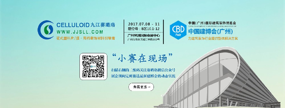 歡迎大家關注九江賽璐珞實業(yè)有限公司微信公眾號,我司將參加2017年廣州建博會。我們將持續(xù)為大家?guī)斫ú钚聞討B(tài),更新時間為8號-11號。每天一更!